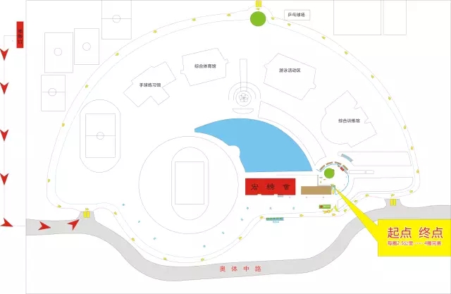 1.入场:地铁8号线,奥体中心站C口出,沿线路图方向进入比赛场地。场地内提供免费停车位,方便开车的参赛者们。赛事起终点位于奥体中心东南门附近(如下图)。